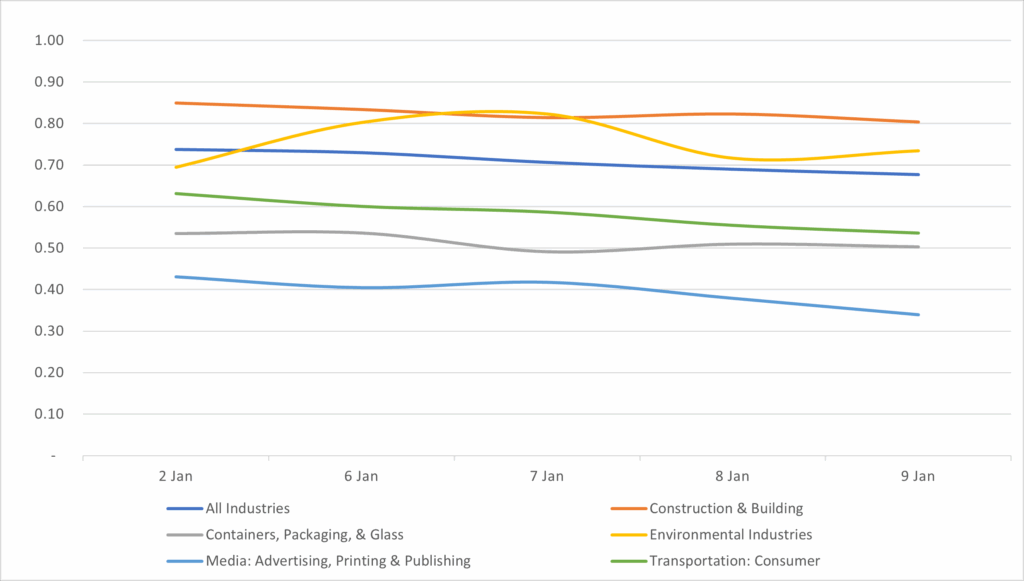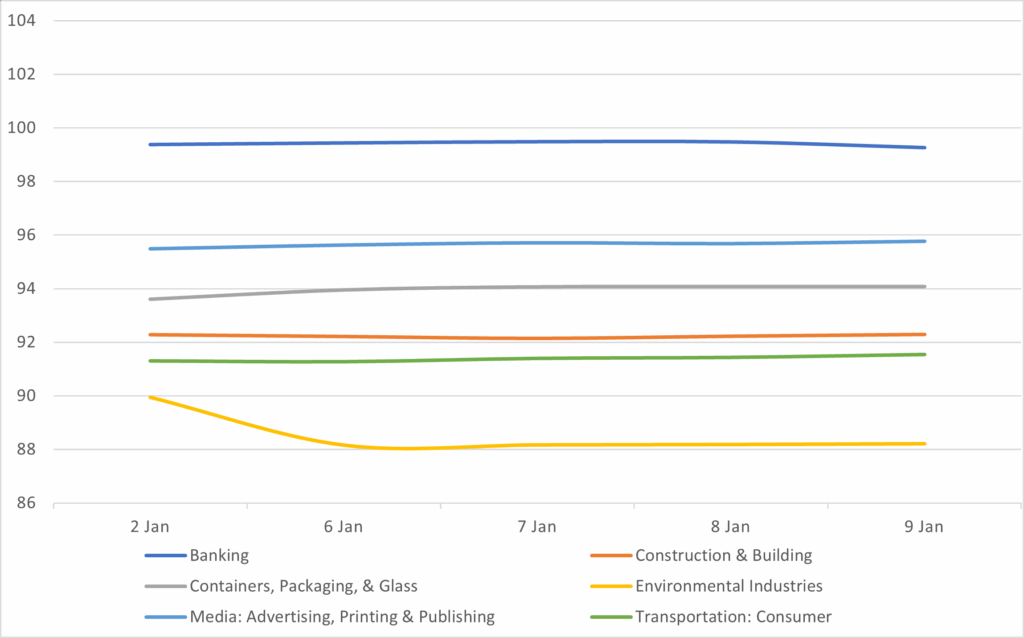 Displays the HY Corp average industry price by sector between 1/2/26 – 1/9/26. Results are based on select industry sectors, however, we offer data across 36 sectors.
