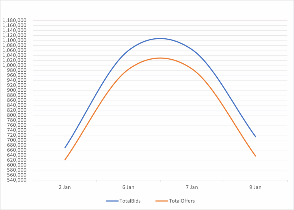 Reveals the total number of quotes by bid and offer between 1/2/26 – 1/9/26