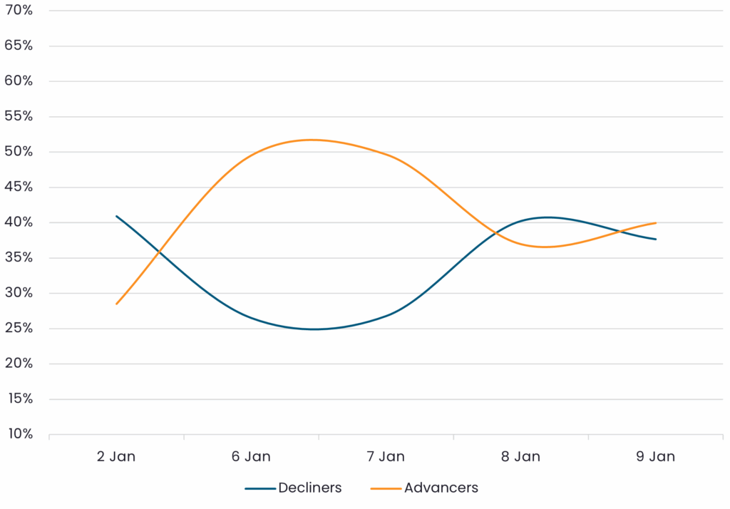 Reveals the percent of HY Corps increasing in price (advancers) vs. HY Corps decreasing in price (decliners) between 1/2/26 – 1/9/26