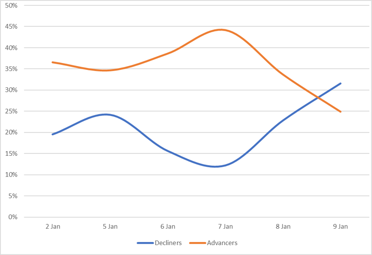 Reveals the percent of Muni bonds increasing in price (advancers) vs. decreasing in price (decliners) between 1/2/26-1/9/26