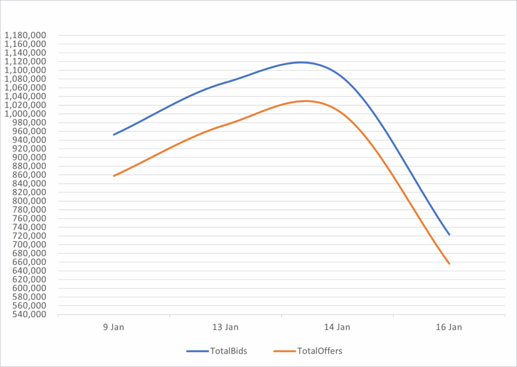 Reveals the total number of quotes by bid and offer between 1/9/26 – 1/16/26
