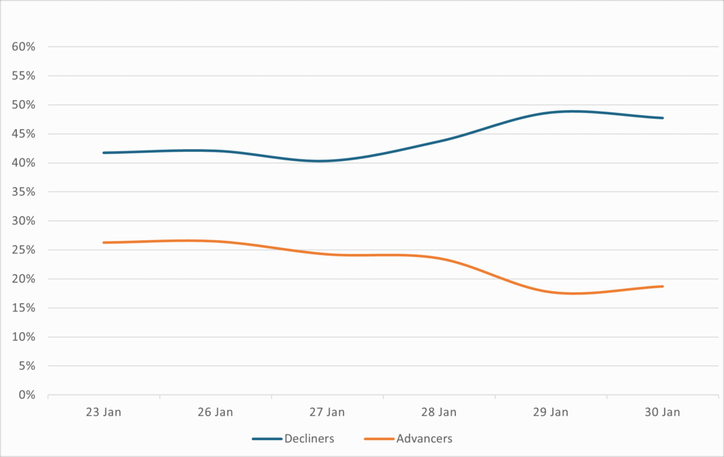 Reveals the percent of loans increasing in price (advancers) vs. loans decreasing in price (decliners) between 1/23/26-1/30/26