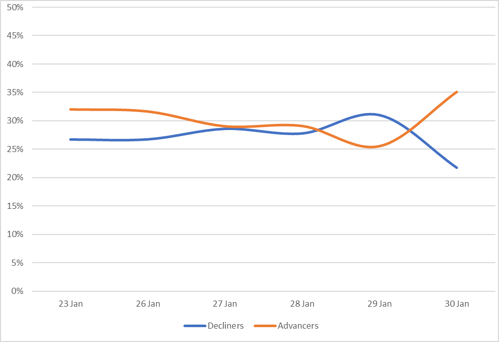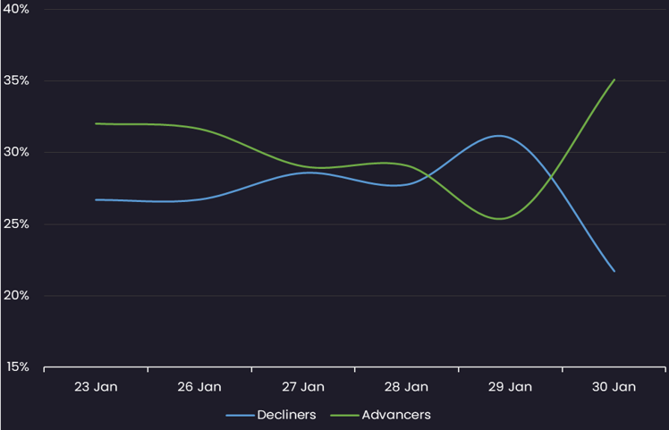 Reveals the percent of Muni bonds increasing in price (advancers) vs. decreasing in price (decliners) between 1/23/26-1/30/26