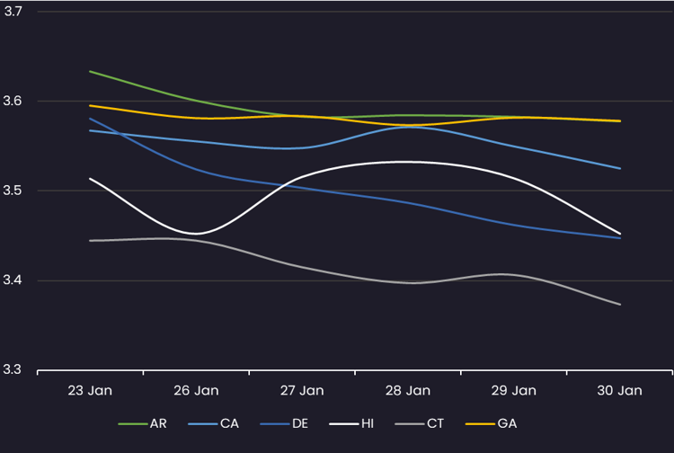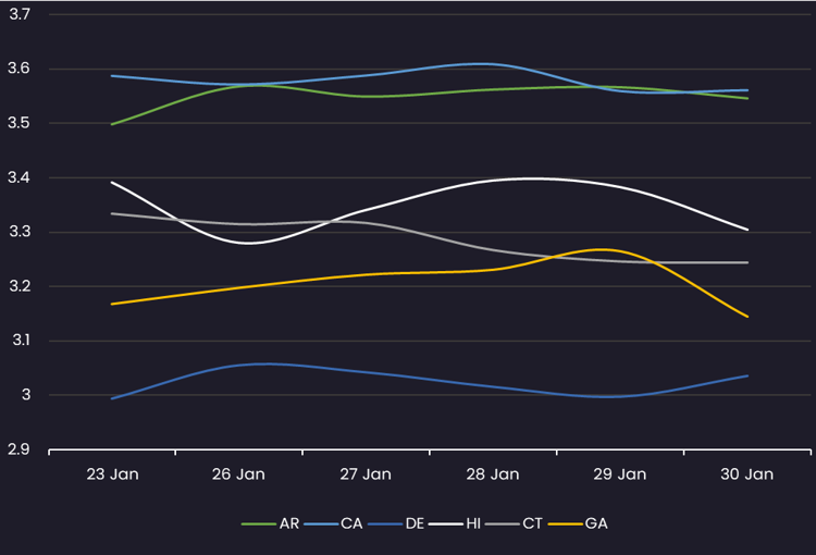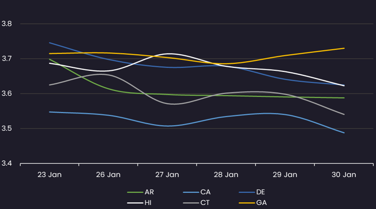Displays the average Muni 10 year yield by state between 1/23/26-1/30/26 (General Obligation and Revenue Bonds). Results are based on 6 select states, however, we offer data across all 50 states and U.S. territories