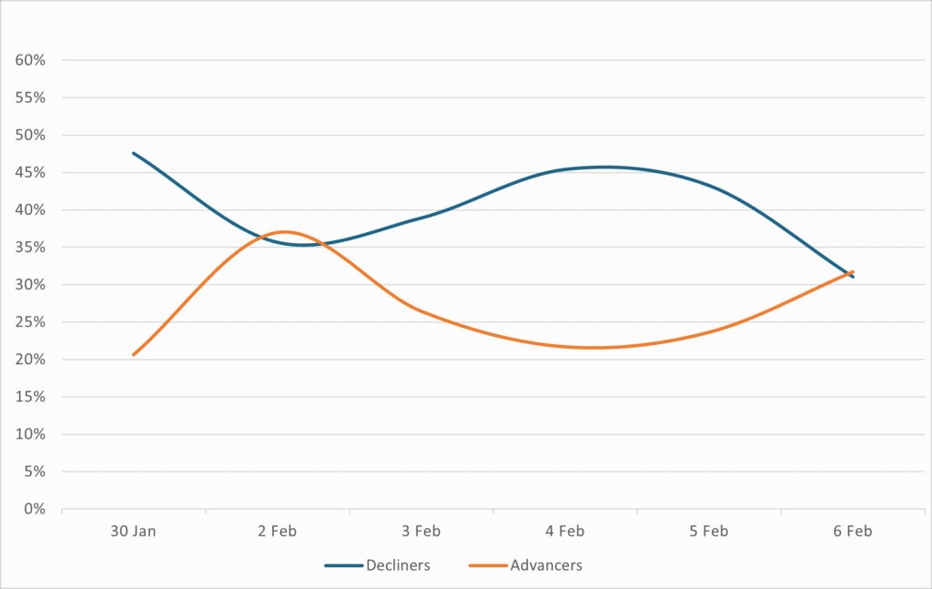 Reveals the percent of loans increasing in price (advancers) vs. loans decreasing in price (decliners) between 1/30/26-2/6/26