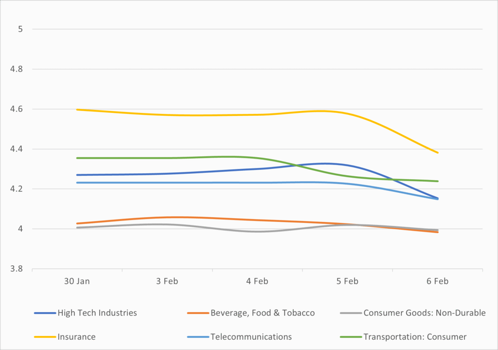 | 9 | Media: Broadcasting & Subscription | ▼ -1 bps | 4.59% | 4.61% |