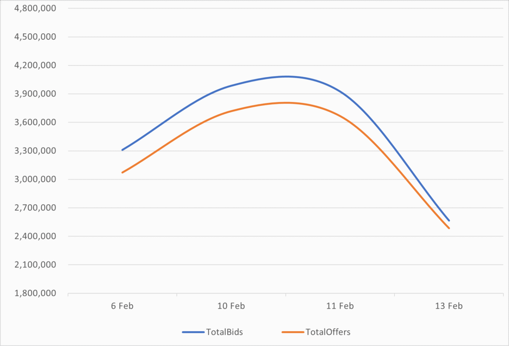 Reveals the total number of quotes by bid and offer between 2/6/26 – 2/13/26