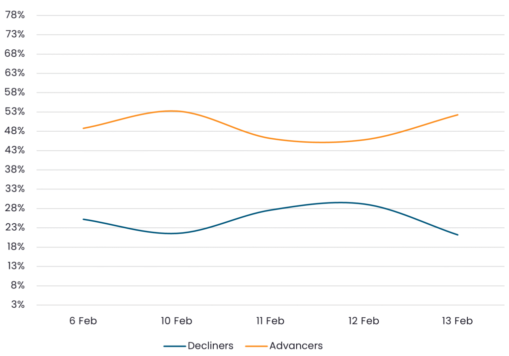 Reveals the percent of IG Corps increasing in price (advancers) vs. IG Corps decreasing in price (decliners) between 2/6/26 – 2/13/26