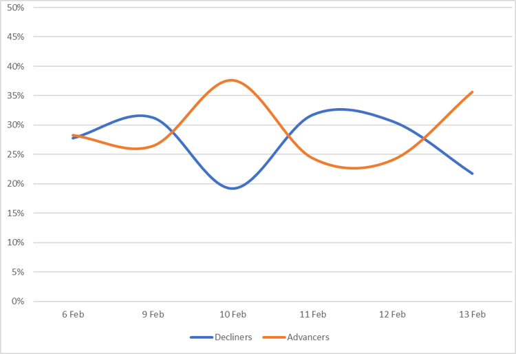 Reveals the percent of Muni bonds increasing in price (advancers) vs. decreasing in price (decliners) between 2/6/26-2/13/26