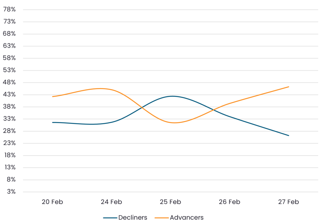 Reveals the percent of IG Corps increasing in price (advancers) vs. IG Corps decreasing in price (decliners) between 2/20/26 – 2/27/26