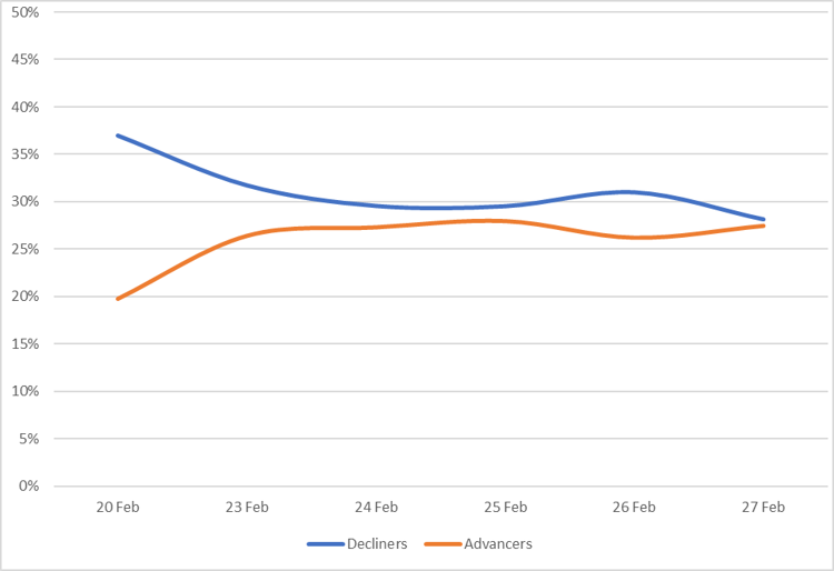 Reveals the percent of Muni bonds increasing in price (advancers) vs. decreasing in price (decliners) between 2/20/26-2/27/26