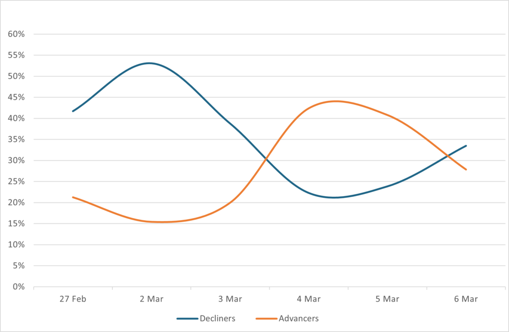 Reveals the percent of loans increasing in price (advancers) vs. loans decreasing in price (decliners) between 2/27/26-3/6/26