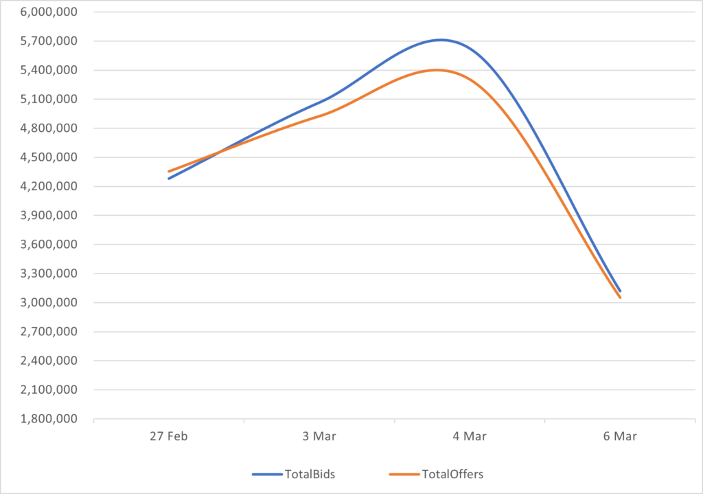 Reveals the total number of quotes by bid and offer between 2/27/26 – 3/6/26