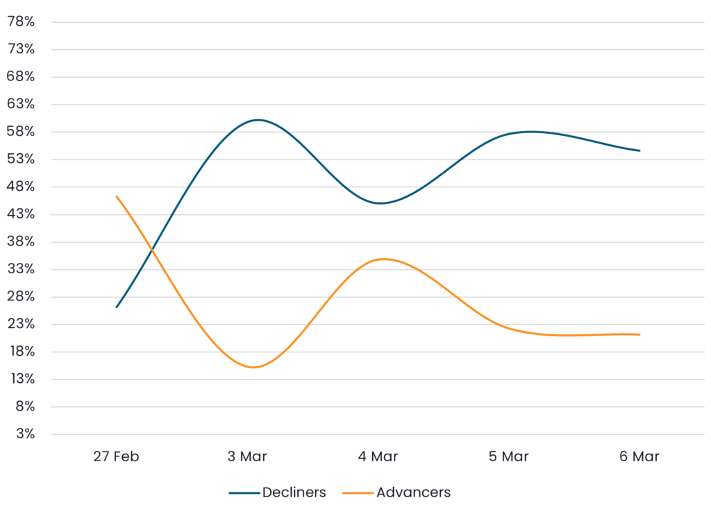 Reveals the percent of IG Corps increasing in price (advancers) vs. IG Corps decreasing in price (decliners) between 2/27/26 – 3/6/26