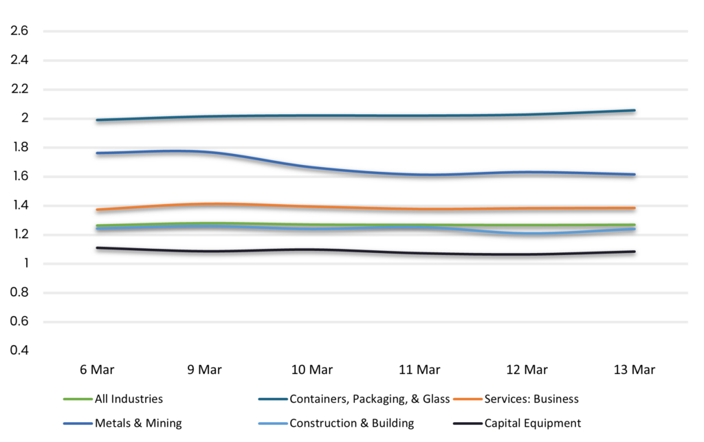 Displays the average loan bid price by sector between 3/6/26-3/13/26. Results are based on select industry sectors, however, we offer data across 36 sectors