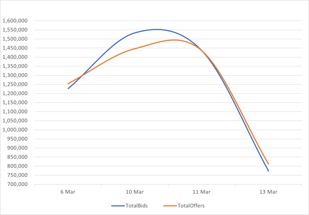 Reveals the total number of quotes by bid and offer between 3/6/26 – 3/13/26