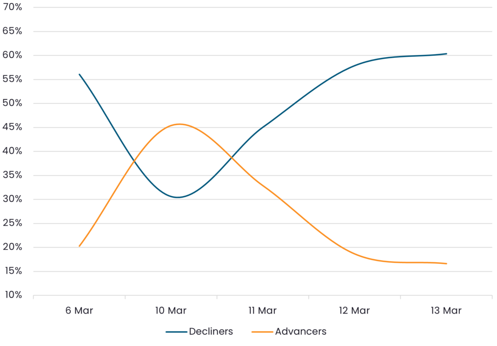 Reveals the percent of HY Corps increasing in price (advancers) vs. HY Corps decreasing in price (decliners) between 3/6/26 – 3/13/26