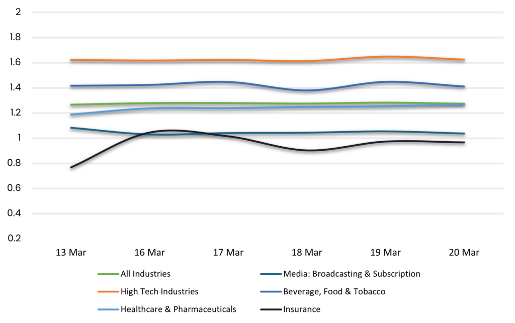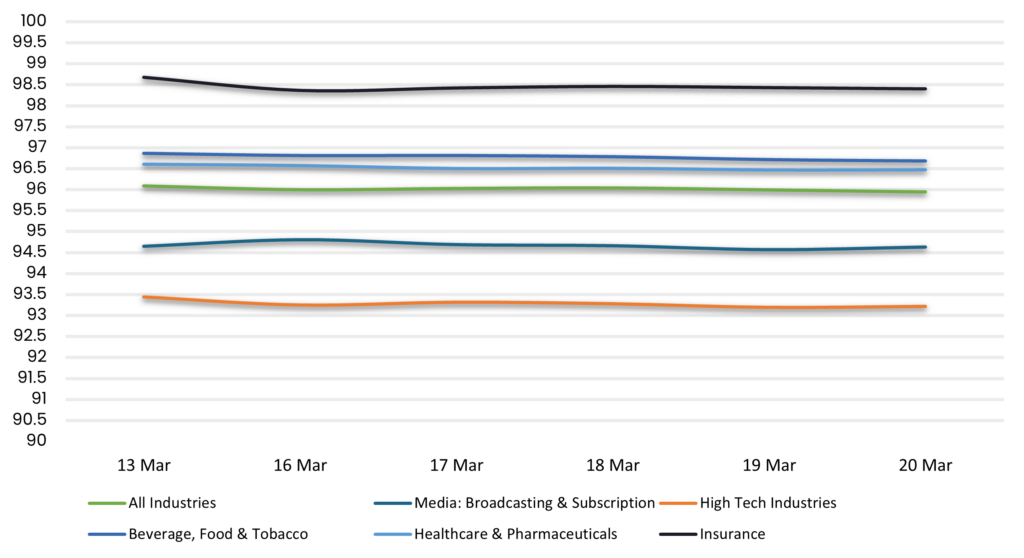 Displays the average loan bid price by sector between 3/13/26-3/20/26. Results are based on select industry sectors, however, we offer data across 36 sectors