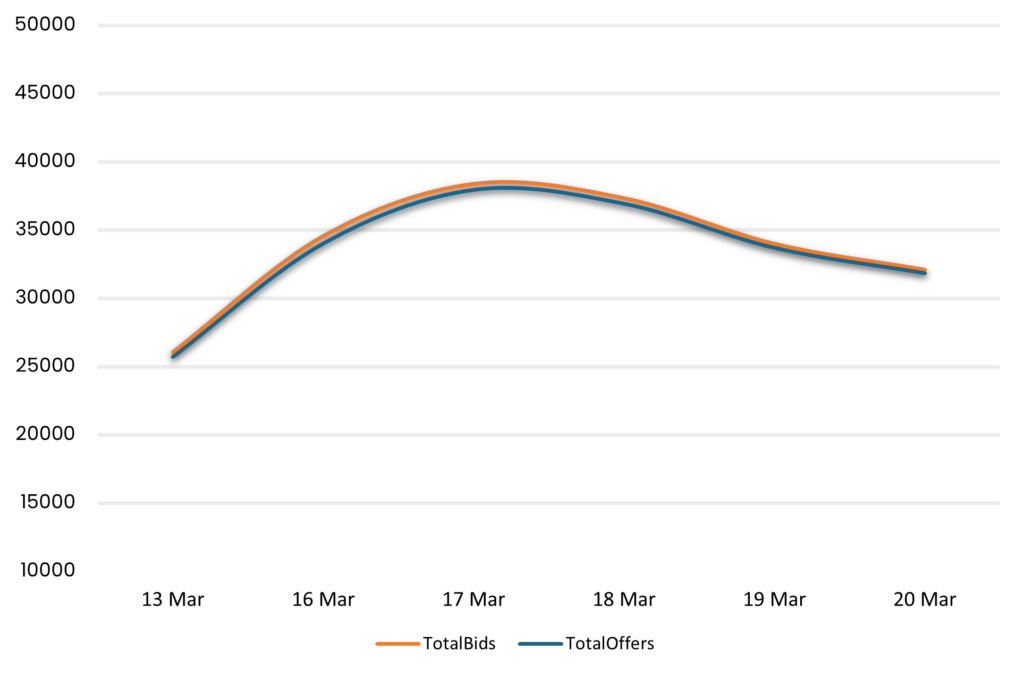 Reveals the total number of quotes by bid and offer between 3/13/26-3/20/26