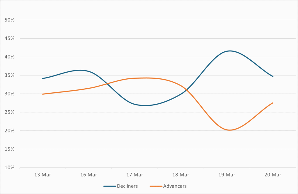 Reveals the percent of loans increasing in price (advancers) vs. loans decreasing in price (decliners) between 3/13/26-3/20/26