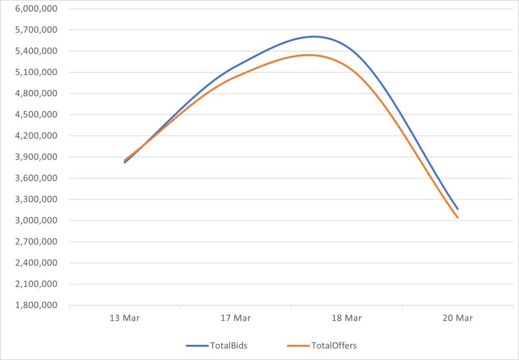 Reveals the total number of quotes by bid and offer between 3/13/26 – 3/20/26
