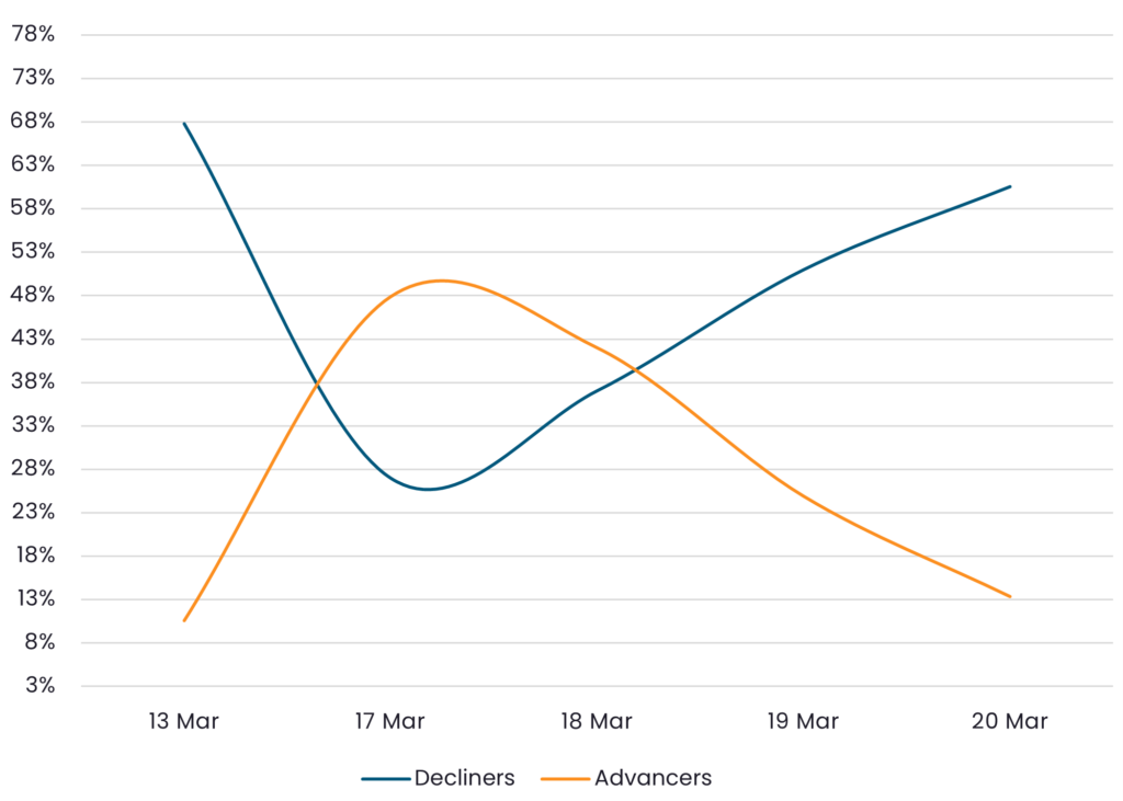 Reveals the percent of IG Corps increasing in price (advancers) vs. IG Corps decreasing in price (decliners) between 3/13/26 – 3/20/26