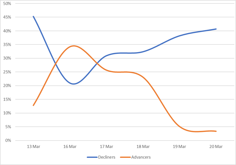 Reveals the percent of Muni bonds increasing in price (advancers) vs. decreasing in price (decliners) between 3/13/26-3/20/26
