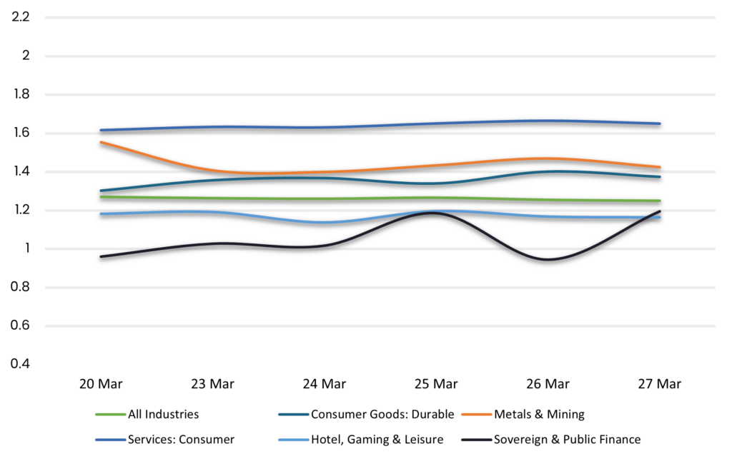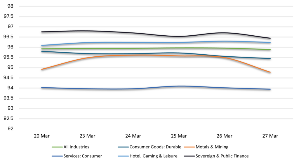 Displays the average loan bid price by sector between 3/20/26-3/27/26. Results are based on select industry sectors, however, we offer data across 36 sectors
