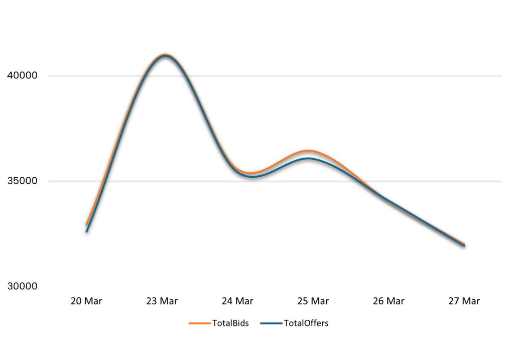 Reveals the total number of quotes by bid and offer between 3/20/26-3/27/26