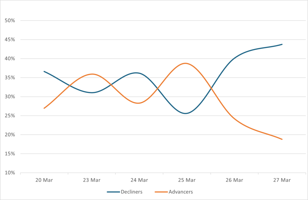 Reveals the percent of loans increasing in price (advancers) vs. loans decreasing in price (decliners) between 3/20/26-3/27/26