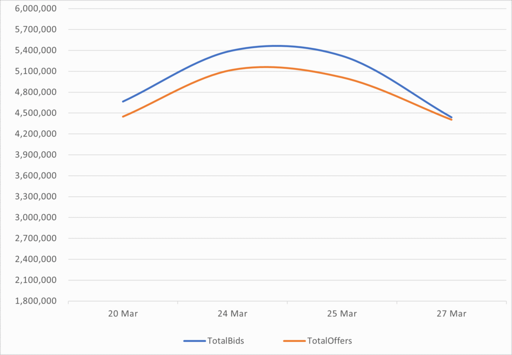 Reveals the total number of quotes by bid and offer between 3/20/26 – 3/27/26