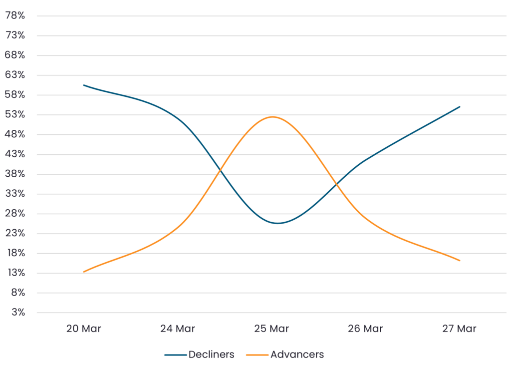 Reveals the percent of IG Corps increasing in price (advancers) vs. IG Corps decreasing in price (decliners) between 3/20/26 – 3/27/26