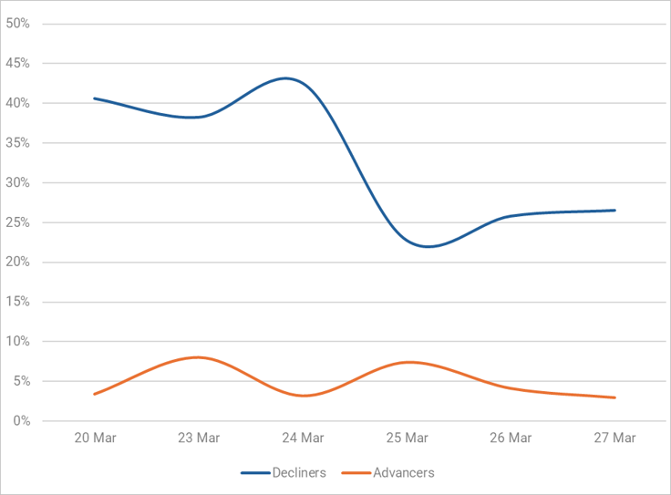 Reveals the percent of Muni bonds increasing in price (advancers) vs. decreasing in price (decliners) between 3/20/26-3/27/26