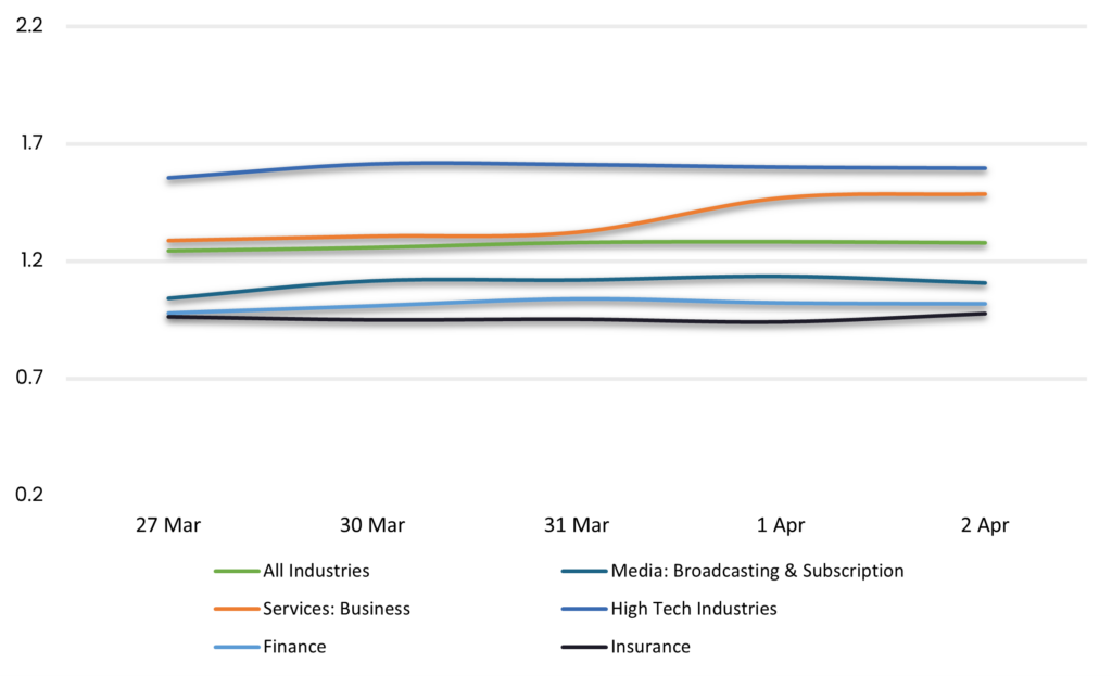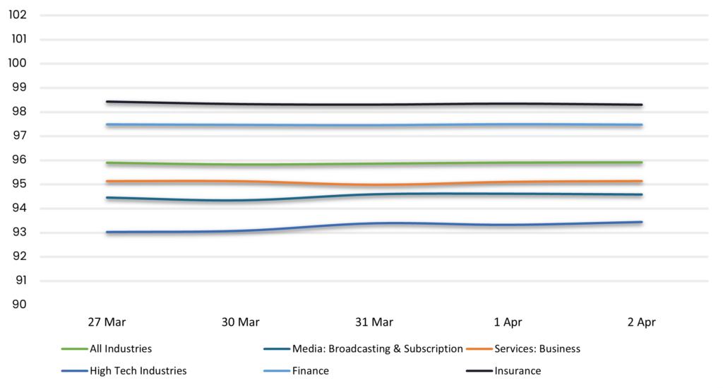 Displays the average loan bid price by sector between 3/27/26-4/3/26. Results are based on select industry sectors, however, we offer data across 36 sectors