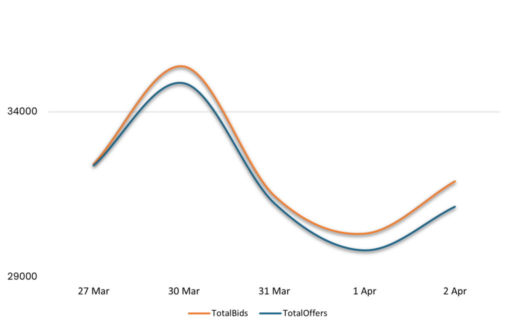Reveals the total number of quotes by bid and offer between 3/27/26-4/3/26