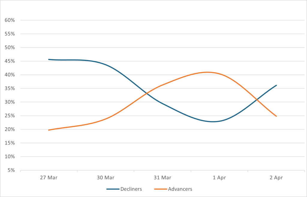 Reveals the percent of loans increasing in price (advancers) vs. loans decreasing in price (decliners) between 3/27/26-4/3/26