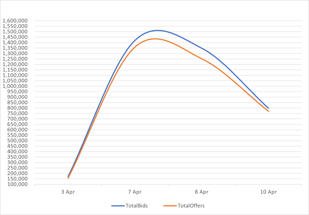 Reveals the total number of quotes by bid and offer between 4/3/26 – 4/10/26