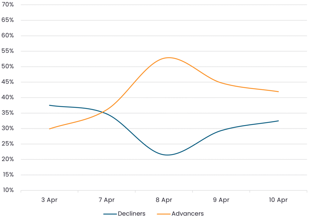Reveals the percent of HY Corps increasing in price (advancers) vs. HY Corps decreasing in price (decliners) between 4/3/26 – 4/10/26
