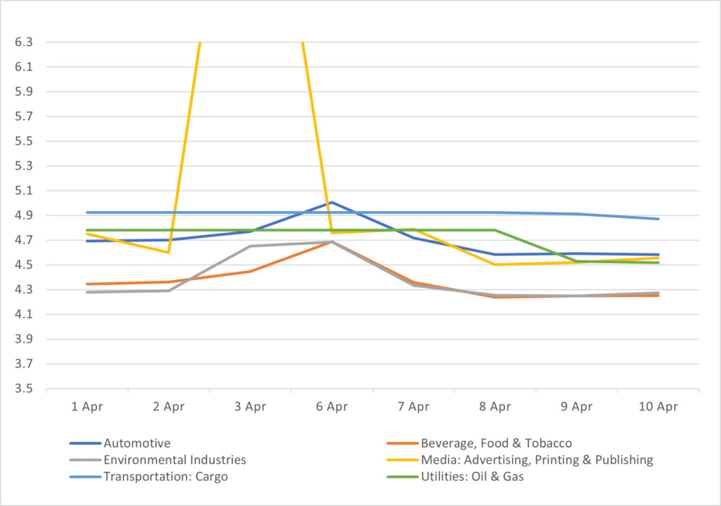 | 9 | Telecommunications | ▼ -28 bps | 4.58% | 4.86% |