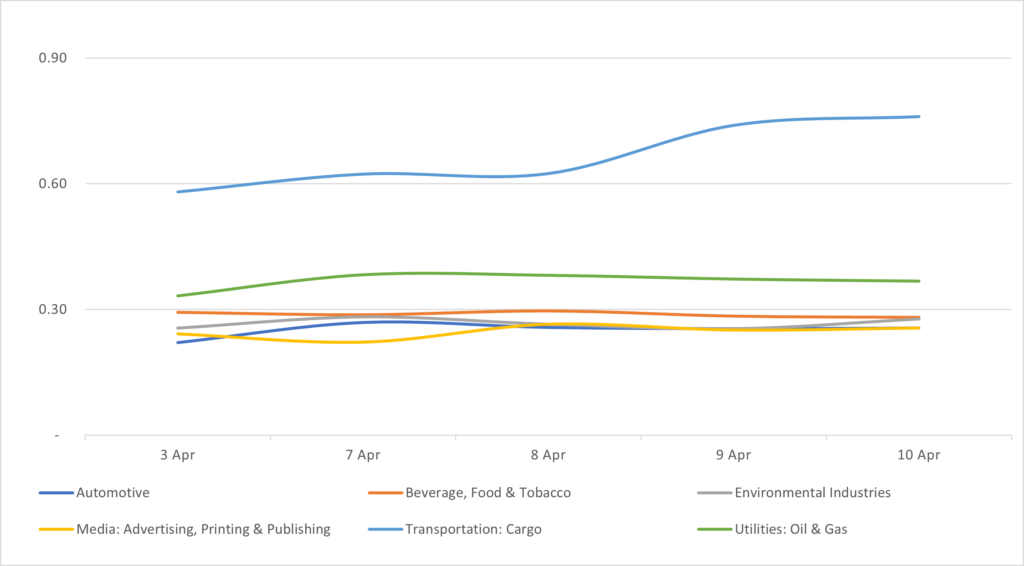 Showcases the bottom 10 IG industry performers based on the largest yield decreases between 4/3/26 – 4/10/26