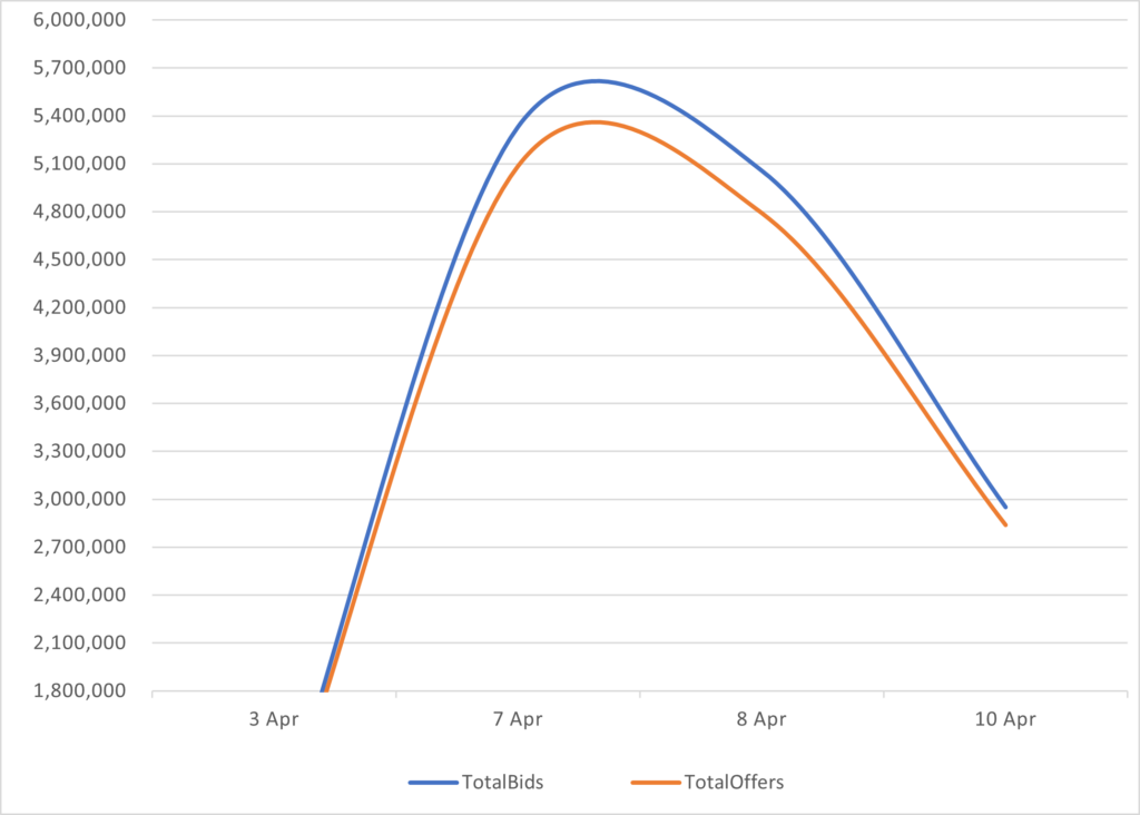 Reveals the total number of quotes by bid and offer between 4/3/26 – 4/10/26