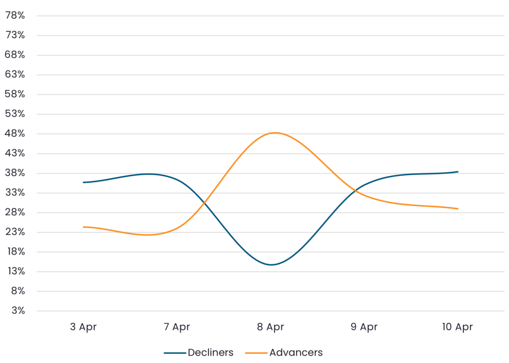 Reveals the percent of IG Corps increasing in price (advancers) vs. IG Corps decreasing in price (decliners) between 4/3/26 – 4/10/26