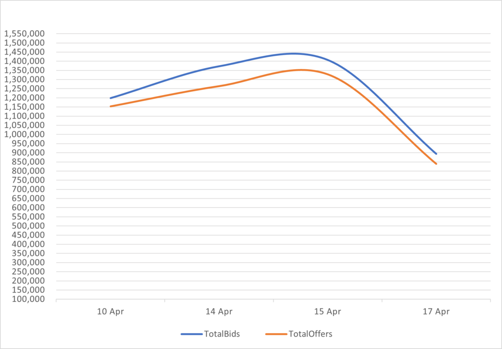 Reveals the total number of quotes by bid and offer between 4/10/26 – 4/17/26