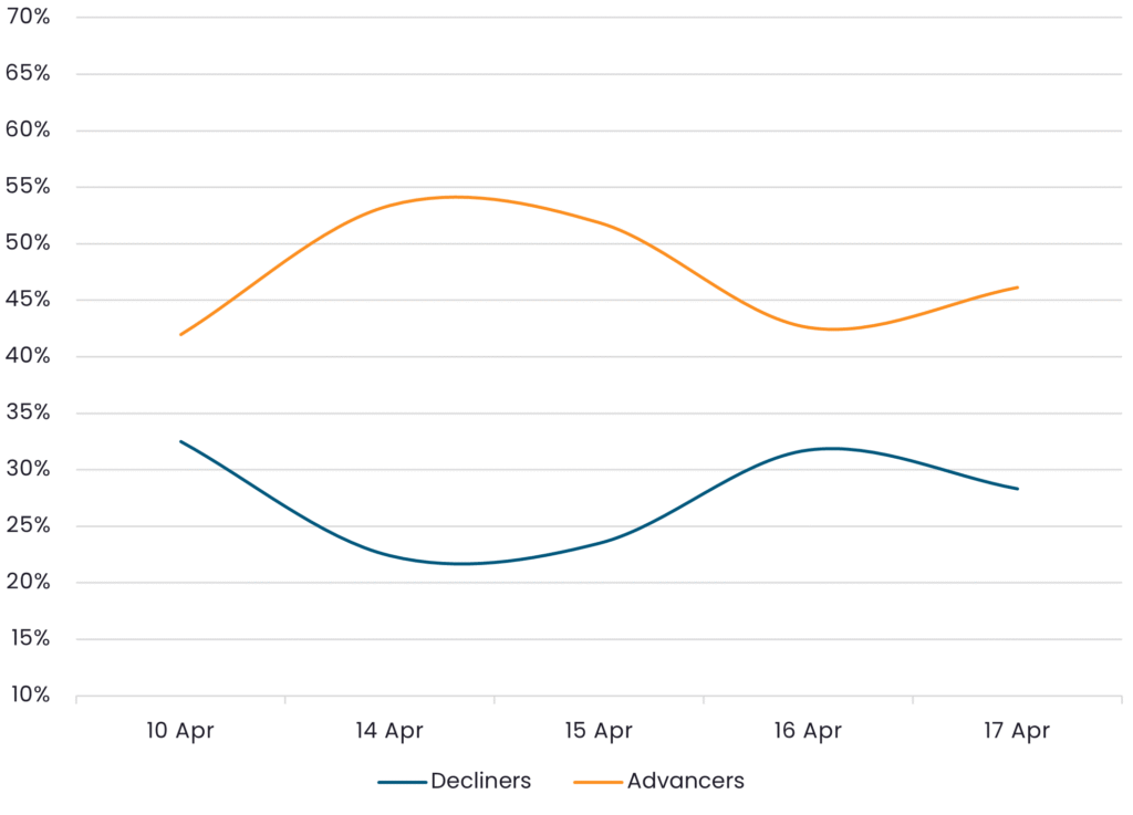 Reveals the percent of HY Corps increasing in price (advancers) vs. HY Corps decreasing in price (decliners) between 4/10/26 – 4/17/26