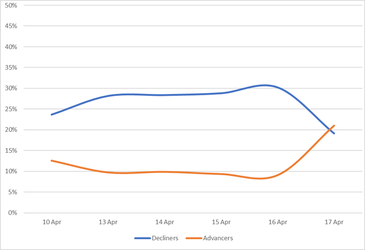 Reveals the percent of Muni bonds increasing in price (advancers) vs. decreasing in price (decliners) between 4/10/26-4/17/26