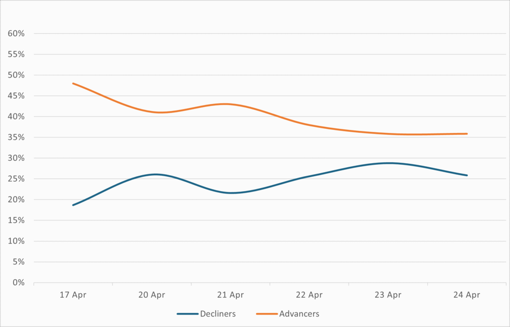 Reveals the percent of loans increasing in price (advancers) vs. loans decreasing in price (decliners) between 4/17/26-4/24/26