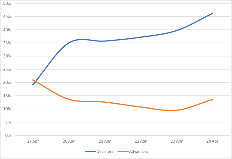 Reveals the percent of Muni bonds increasing in price (advancers) vs. decreasing in price (decliners) between 4/17/26-4/24/26