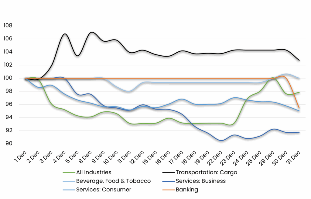 Displays the HY CDS spread by industry between 12/1/25 – 12/31/25 Results are based on select industry sectors, however, we offer data across 36 sectors
