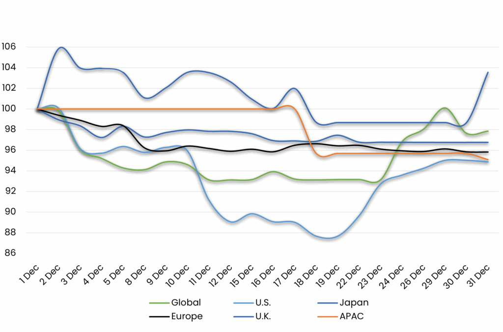 Displays the HY CDS spread by region between 12/1/25 – 12/31/25 Results are based on select regions, however, we offer data across 12 regions