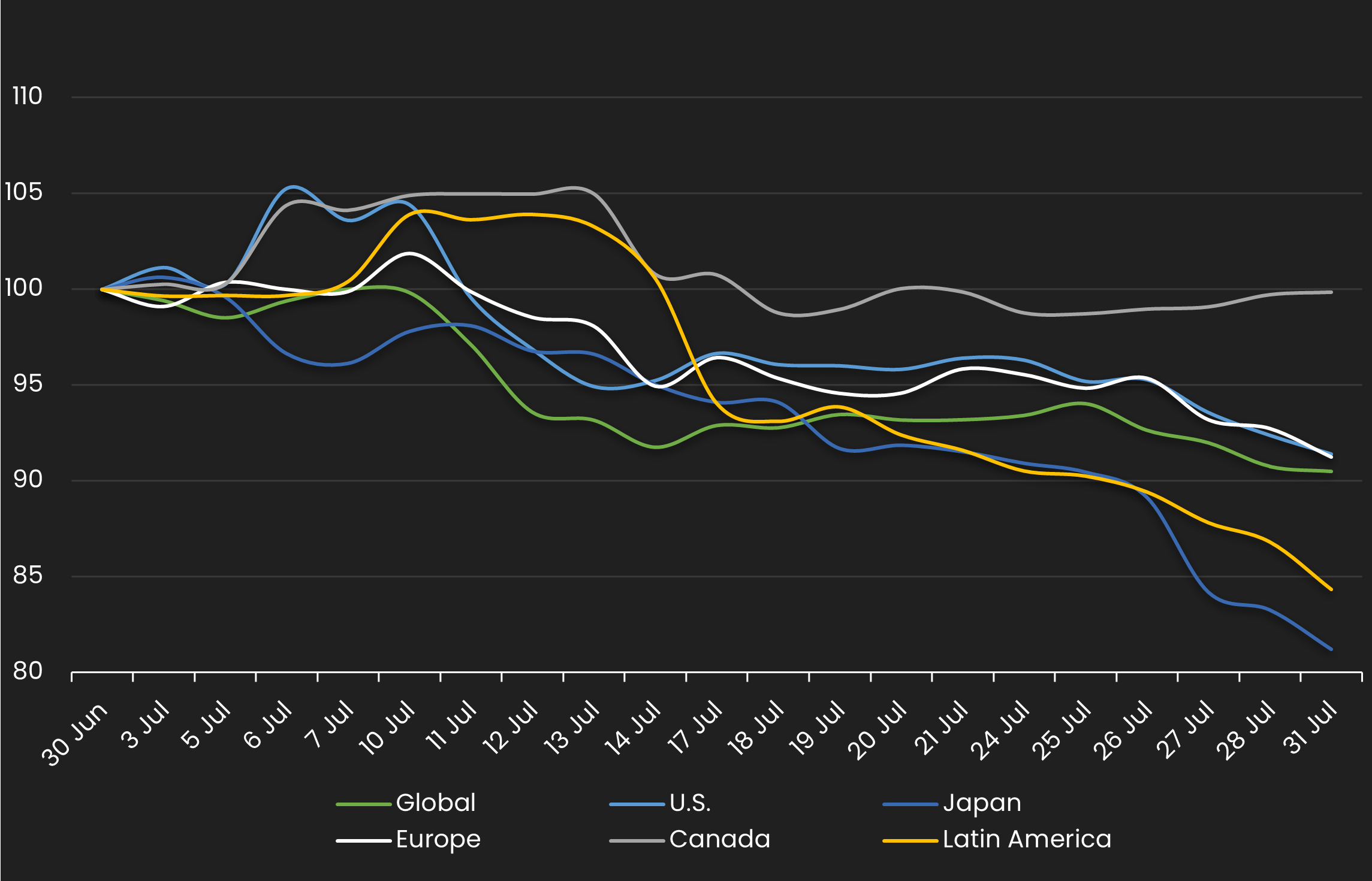 Displays the HY CDS spread by region between 7/1/23 – 7/31/23 Results are based on 5 select regions, however, we offer data across 12 regions